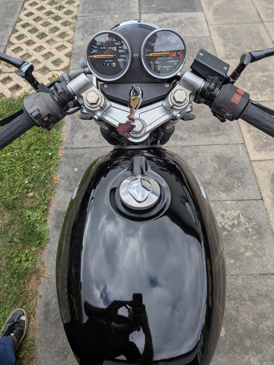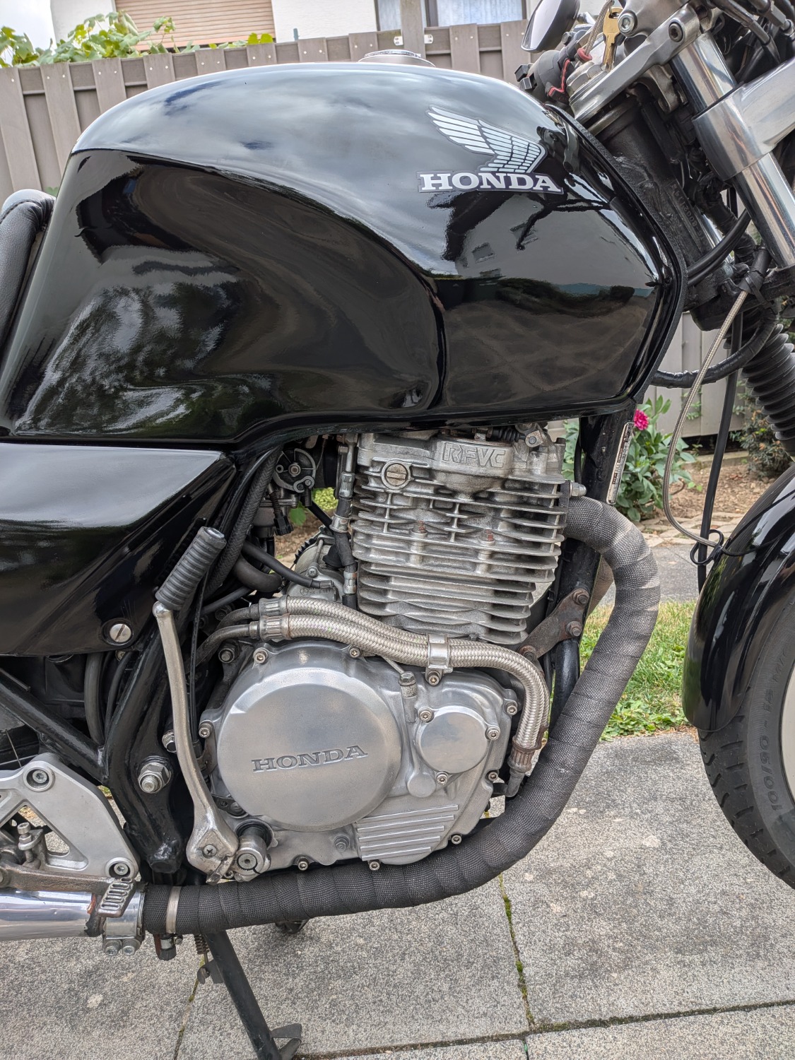 Des weiteren ist die Maschine auf kleinere LED-Blinker samt passendem Blinkrelais umgerüstet. Die Gabel der Honda ist dicht,